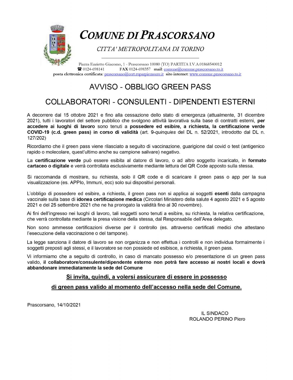 OBBLIGO DAL 15.10.2021 PER COLLABORATORI - CONSULENTI - DIPENDENTI ESTERNI