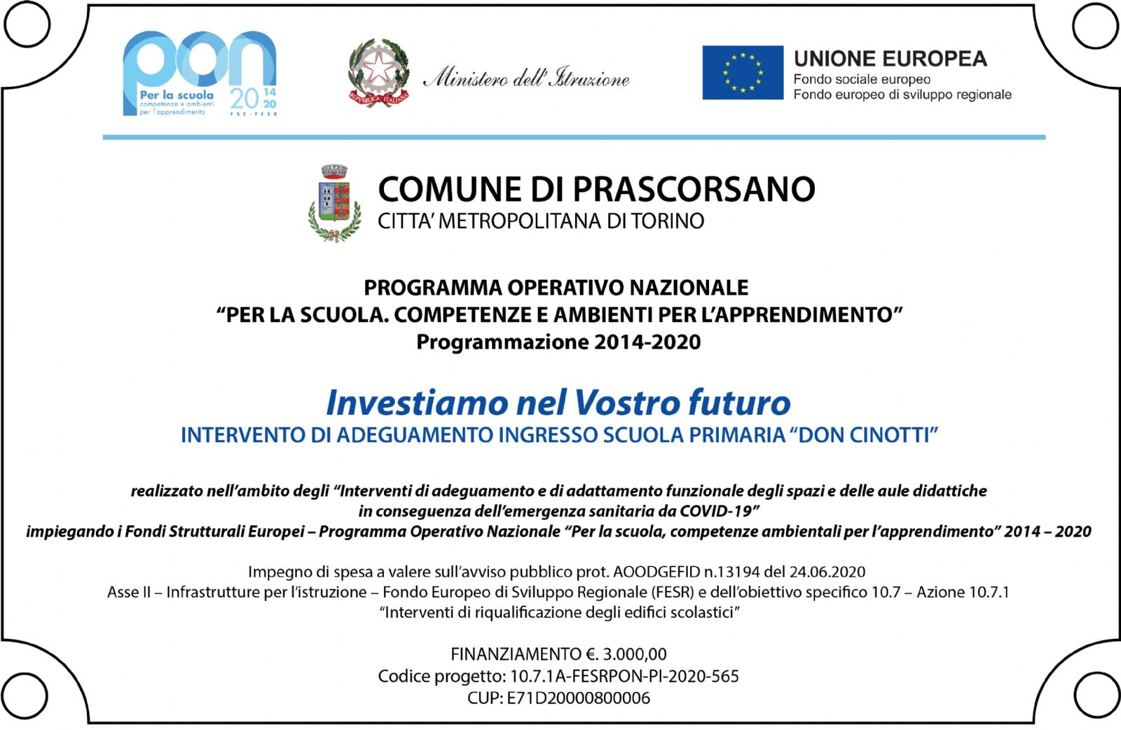 Tale adeguamento consiste nell’installazione di una lama d’aria da posizionarsi sulla porta di ingresso principale della scuola primaria Don Cinotti, completa di collegamenti elettrici e regolazione oraria per l’accensione e lo spegnimento della stessa sulla base di orari preimpostati, in quanto a seguito dell’emergenza COVID-19 le operazioni obbligatorie di controllo della temperatura degli alunni, che avviene in prossimità dell’ingresso, impediscono la chiusura del portone principale fino al loro completamento, provocando così un inutile dispersione di calore tra gli ambienti interni ed esterni.