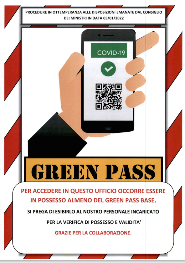 Si comunica che con riferimento al decreto legge n.1 del 7/01/2022 dal 1 febbraio 2022 al 31 marzo 2022 l’accesso agli uffici comunali da parte degli utenti è consentito esclusivamente ai soggetti muniti della certificazione verde covid-19 (di cui al d.l. 52 del 22 aprile 2021 e s.m.i.), cioè a coloro che possiedono il green pass base* e avranno l’obbligo di esibirlo per le dovute verifiche.