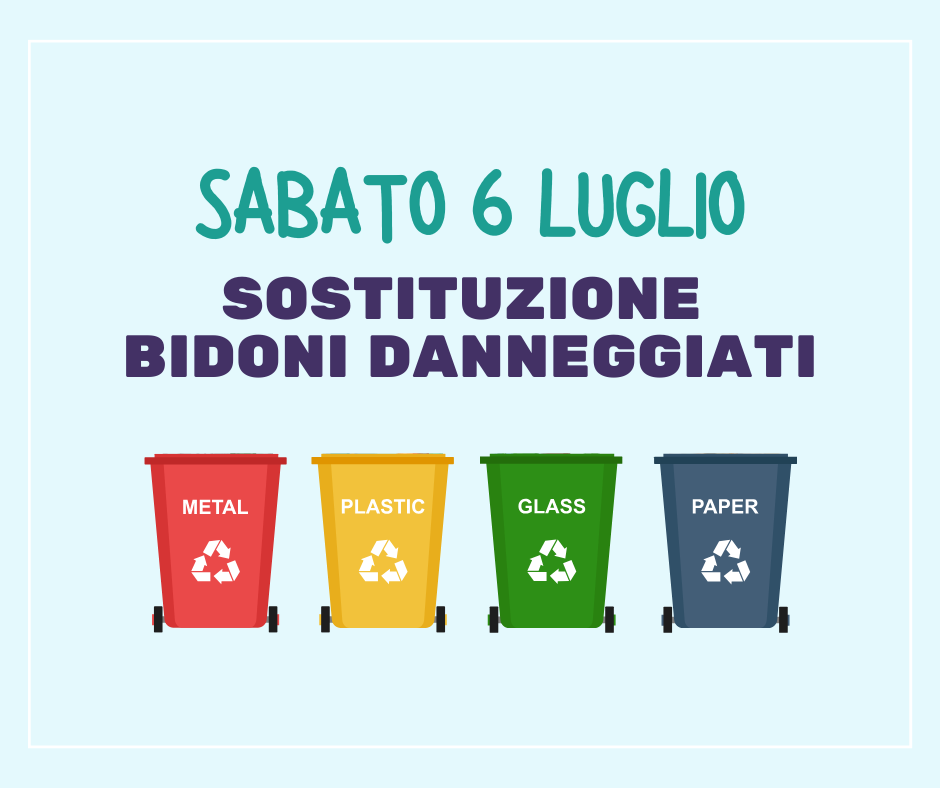 A seguito dall'evento meteorologico del 29.06.2024, chi ha avuto danni ai bidoni della raccolta rifiuti, può recarsi sabato 6 luglio 2024 dalle ore 9.00 alle ore 16.00 in Piazza della Cultura davanti all'ufficio Postale per chiedere la sostituzione dei bidoni danneggiati.