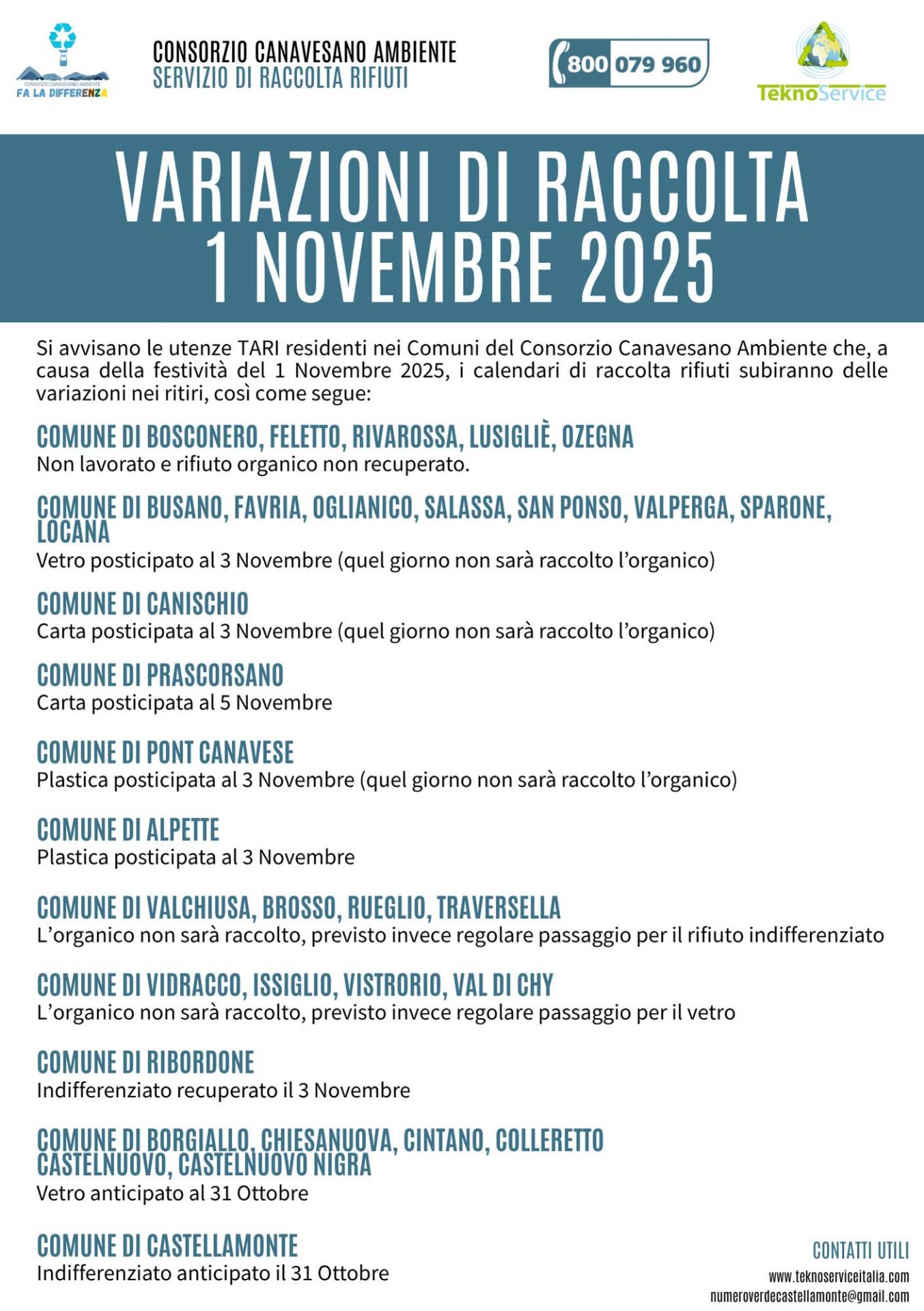 Si informano le utenze TARI dei Comuni del Consorzio Canavesano Ambiente che, in occasione della festività di Ognissanti, i servizi di raccolta subiranno alcune modifiche e recuperi.