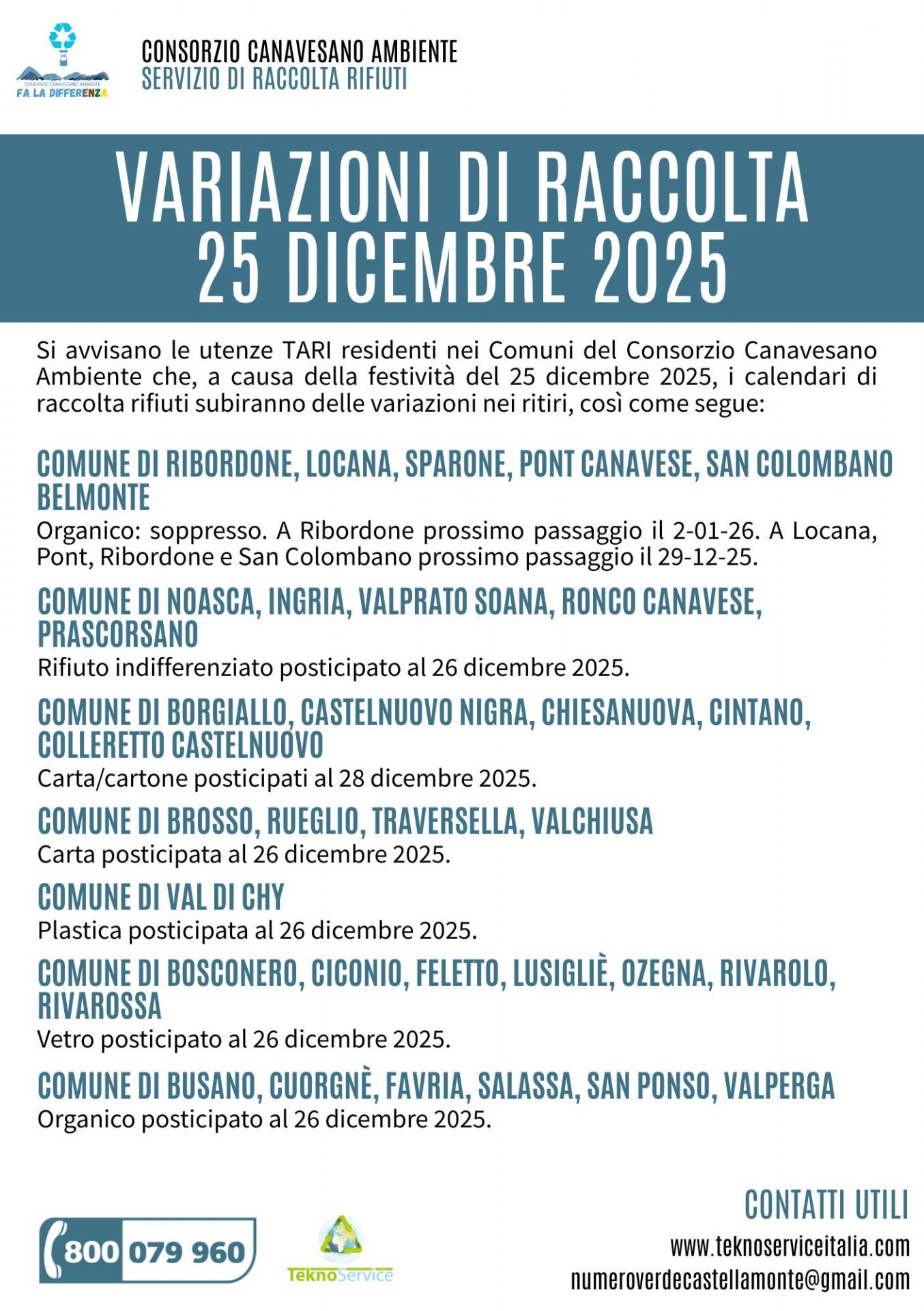 Si informano le utenze TARI dei Comuni del Consorzio Canavesano Ambiente che, in occasione della festività del 25 dicembre, i servizi di raccolta subiranno alcune modifiche e recuperi.