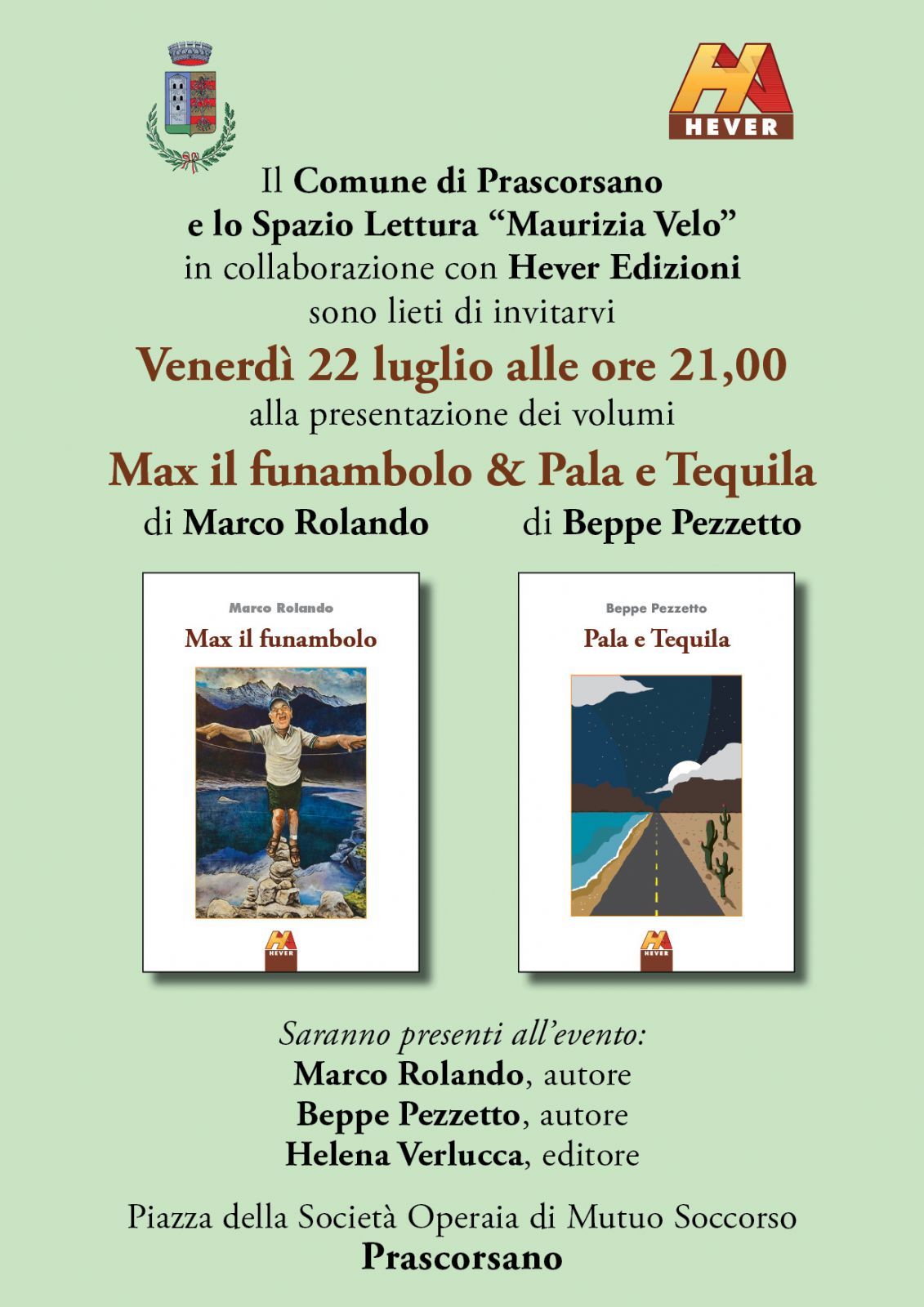 Il Comune di Prascorsano e lo Spazio Lettura “Maurizia Velo” in collaborazione con Hever Edizioni sono lieti di invitarvi Venerdì 22 luglio alle ore 21,00 alla presentazione dei volumi