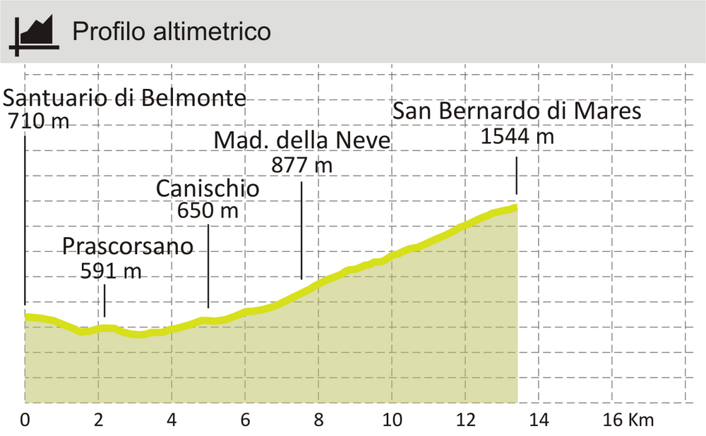 L’itinerario inizia dal Santuario di Belmonte, continua passando per Prascorsano, Canischio e la Madonna della Neve, per poi arrivare alla punta di San Bernardo di Mares dove troviamo la cappella-rifugio dedicata a San Bernardo da Mentone, protettore dei montanari e dei viaggiatori della montagna.