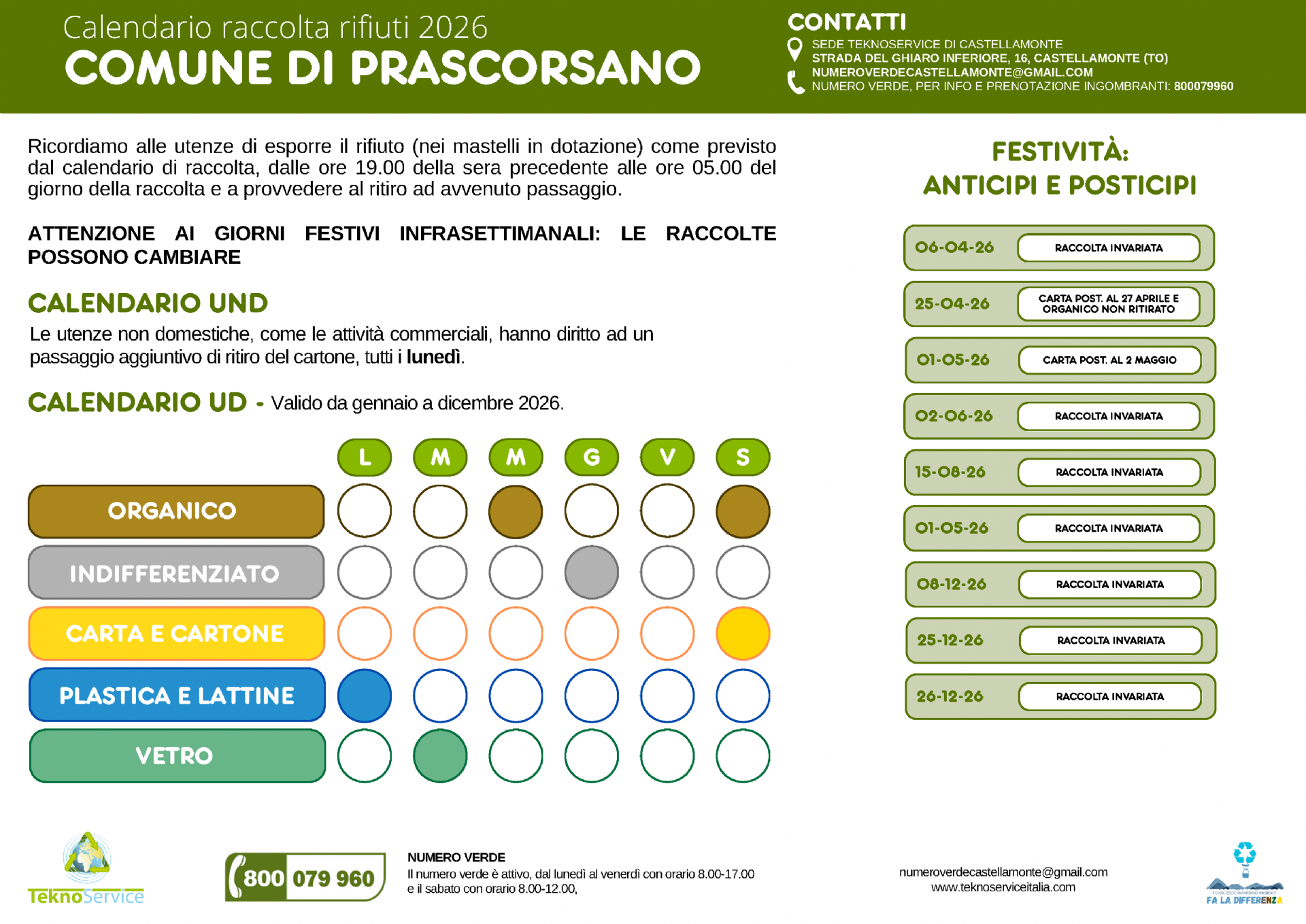 Calendario raccolta rifiuti 2026 per utenze domestiche e non domestiche.