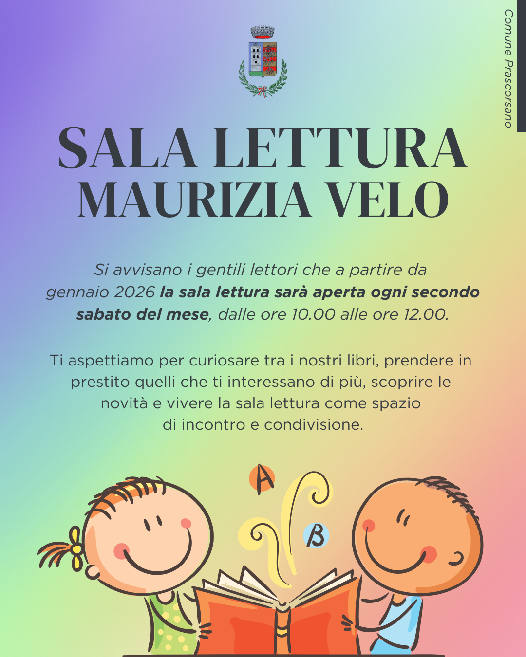 Si avvisano i gentili lettori che a partire da gennaio 2026 la sala lettura sarà aperta ogni secondo sabato del mese, dalle ore 10.00 alle ore 12.00.