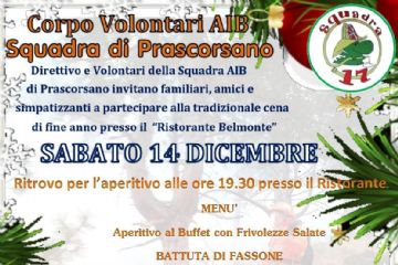 Direttivo e Volontari della Squadra AIB di Prascorsano invitano familiari, amici e simpatizzanti a partecipare alla tradizionale cena di fine anno presso il "Ristorante Belmonte"