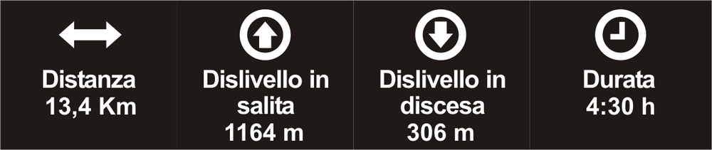 La camminata è lunga 13,4 km e dura all’incirca 4 ore alternata da vari dislivelli, in salita si arriva ai 1164 m mentre in discesa ai 306 m.