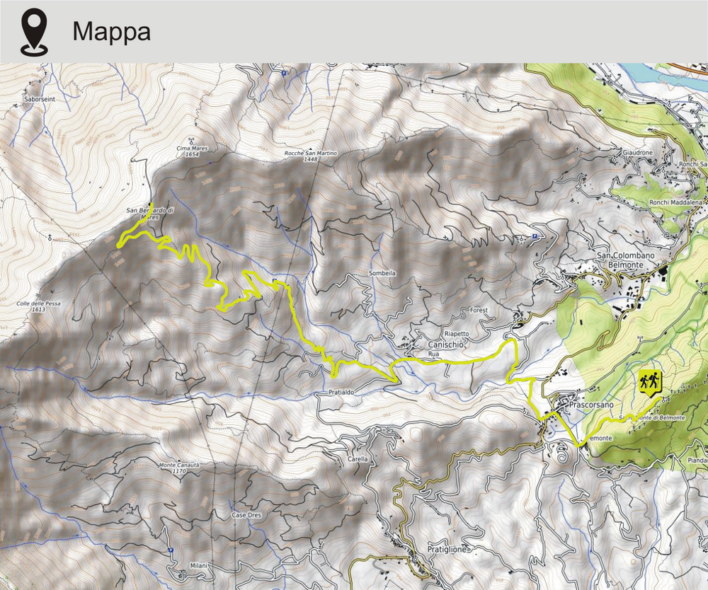 L’itinerario inizia dal Santuario di Belmonte, continua passando per Prascorsano, Canischio e la Madonna della Neve, per poi arrivare alla punta di San Bernardo di Mares dove troviamo la cappella-rifugio dedicata a San Bernardo da Mentone, protettore dei montanari e dei viaggiatori della montagna.